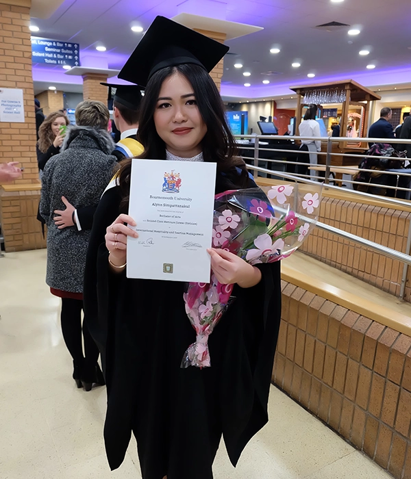 จบปริญาตรีปีที่ 3 จากมหาวิทยาลัย : Bournemouth University – 1 ใน 150 มหาวิทยาลัยสมัยใหม่ที่ดีที่สุดในโลก จากเว็บไซต์ Times higher education ประเทศอังกฤษปัจจุบัน